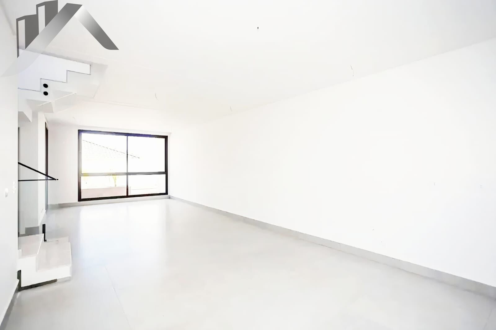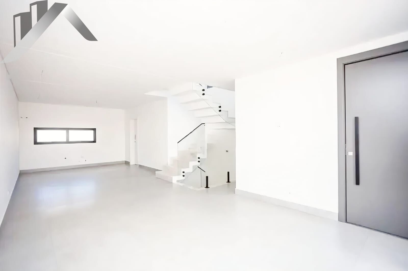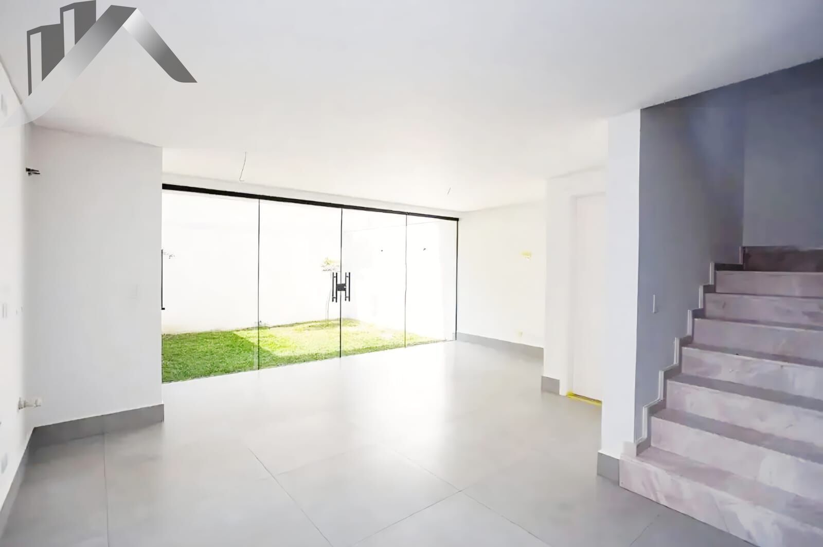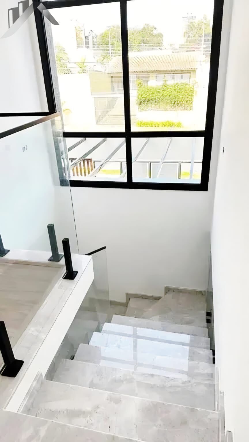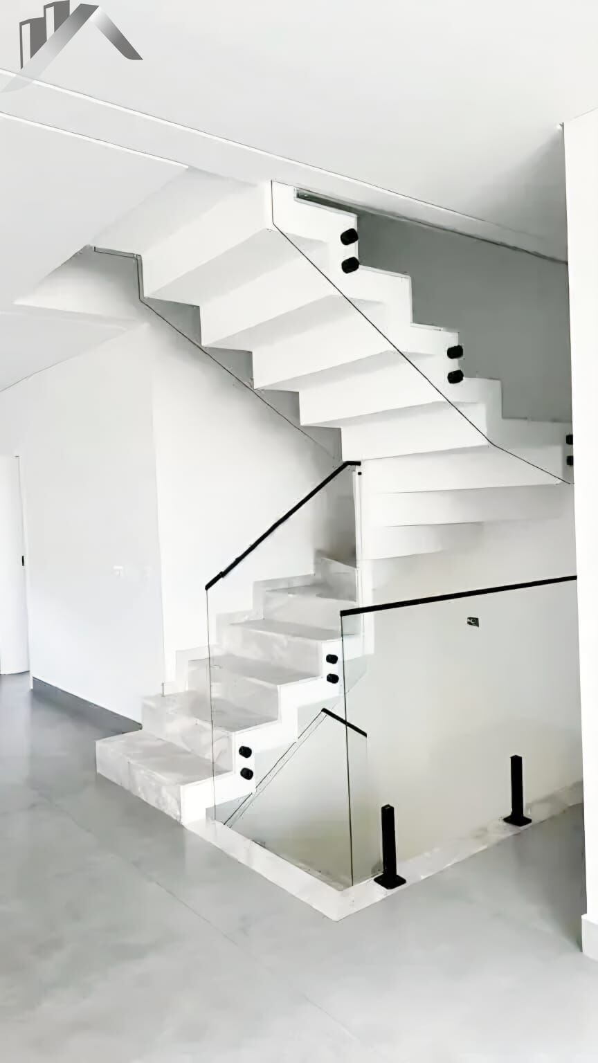 •Escadas em ma?rmore Branco Parana? com guarda-corpo em vidro temperado