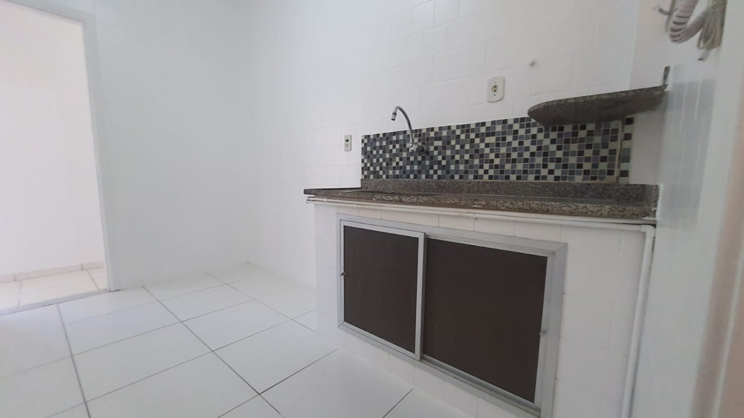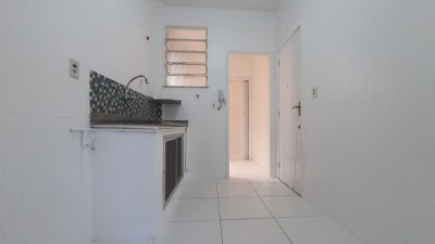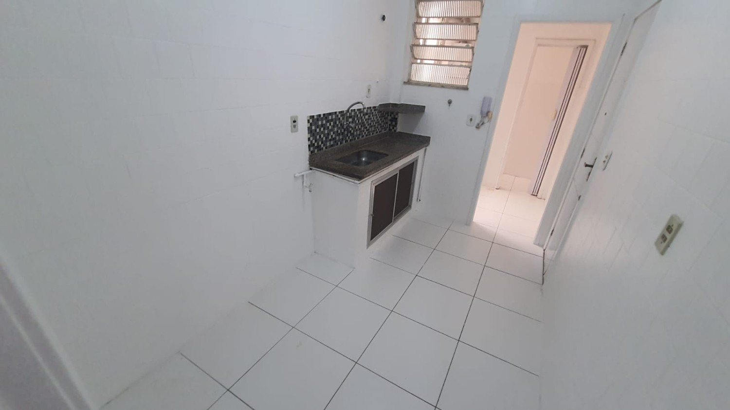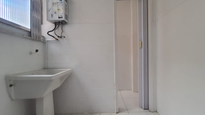 Temos, ainda, a cozinha e a área de serviço, separadas, seguindo o mesmo padrão de revestimento e um banheiro de serviço.