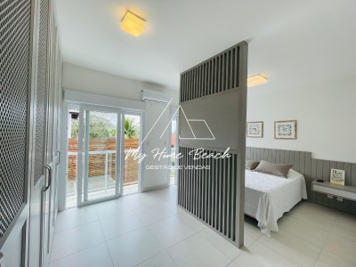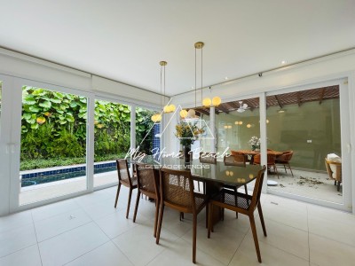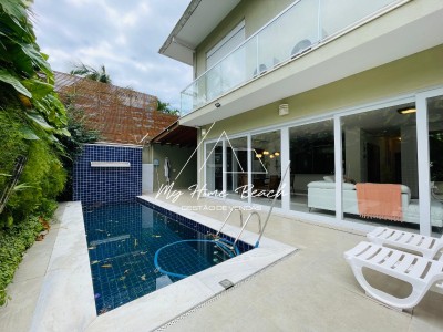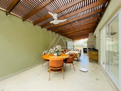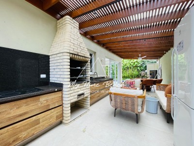 Descrição › Casa com 240 metros distribuídos em ampla sala com cozinha americana, 5 suítes, varanda com churrasqueira, piscina privativa e vaga para 2 autos .