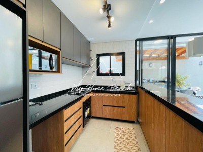 Descrição › Sobrado composto de 3 suítes no piso superior, sala de tv e jantar, cozinha americana, lavabo, piscina e churrasqueira privativa.