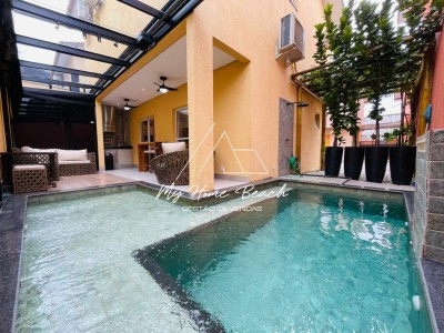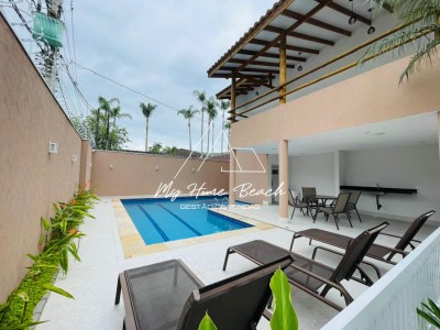 Descrição › Sobrado composto de 3 suítes no piso superior, 1 suíte com sacada, Sala de tv e jantar, Cozinha americana, Lavabo, Varanda com churrasqueira e piscina, 2 vagas.