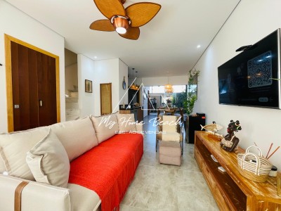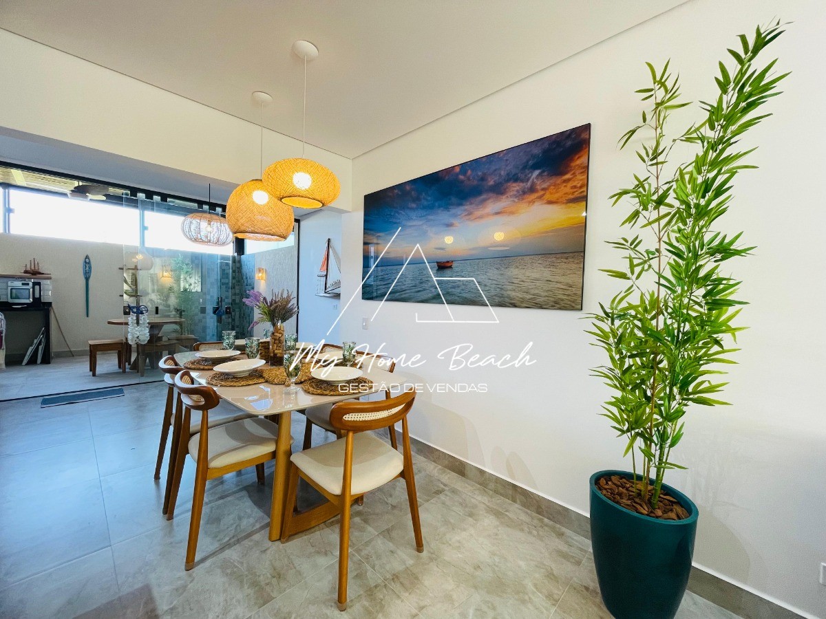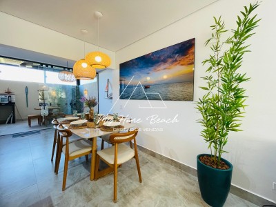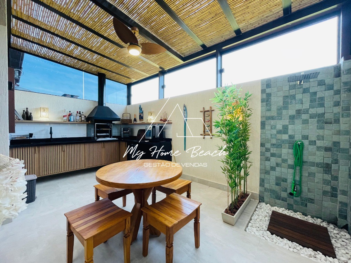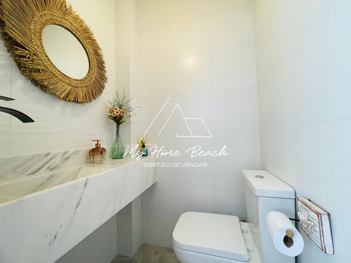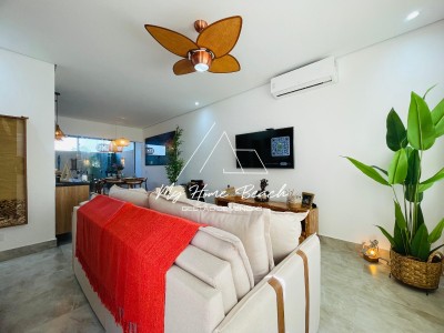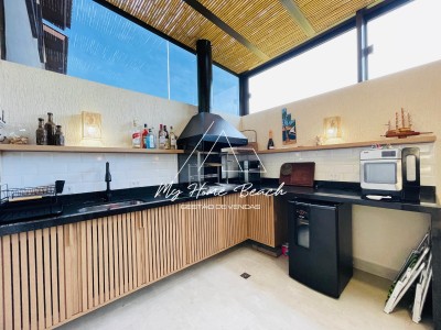 Descrição › Casa dentro de condomínio fechado, composto por 34 unidades de 120 metros, Casa assobradada distribuída em sala com cozinha americana, lavabos, três suítes, varanda gourmet com teto retrátil, e vaga para um auto.
