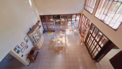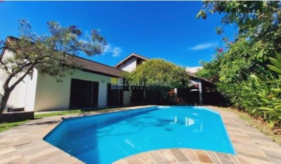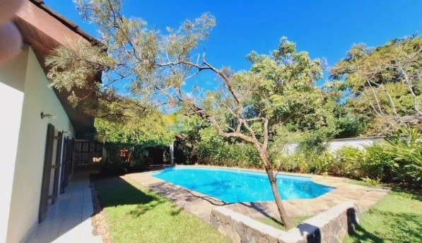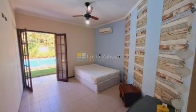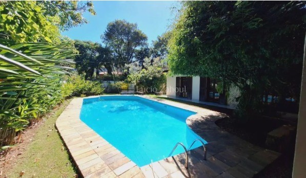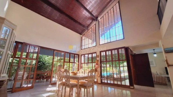 São 5 suítes, sala ampla, piscina, área gourmet, amplo quintal, várias vagas para carro em um terreno de 760 m2 e 566 m2 de áre