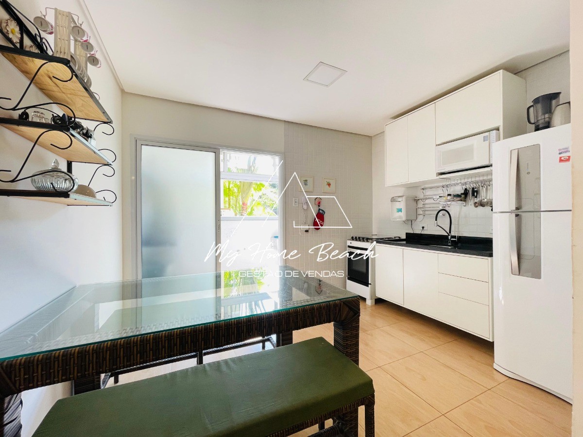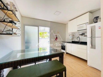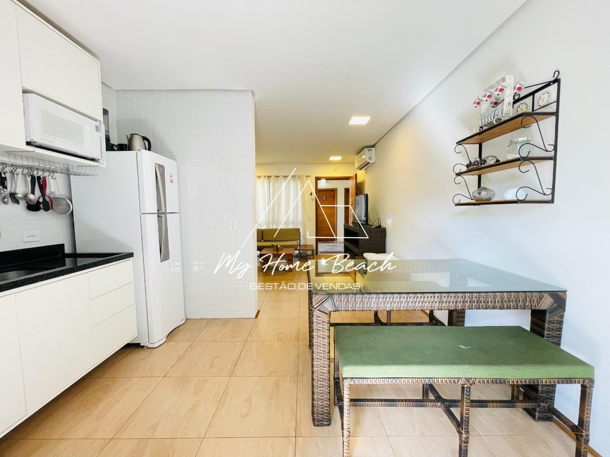 Descrição › Flat com 52 metros distribuído em sala com cozinha americana, 2 dormitórios, 1 banheiro, varanda com churrasqueira, 1 vaga.